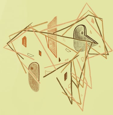 Cactus City, Linocut and 5 cuts of Moving Image, 9"x12", 2020